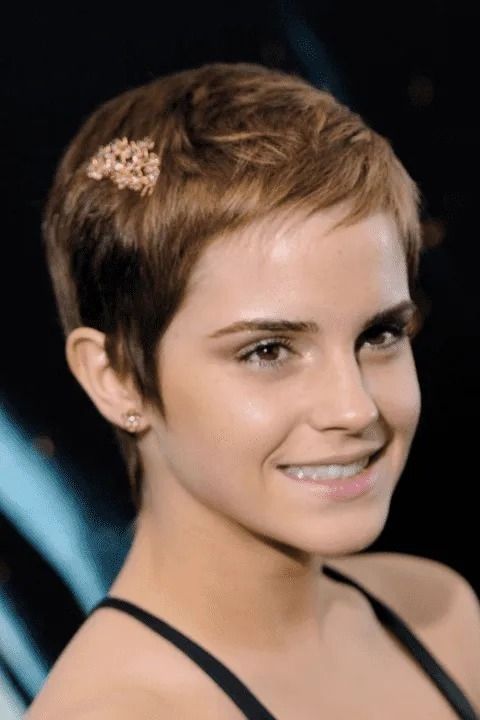Cabello corto con accesorio: un claro ejemplo es la actriz Emma Watson quien lleva un corte pixie ligeramente peinado y decide colocar un accesorio para darle un toque juvenil a su look.