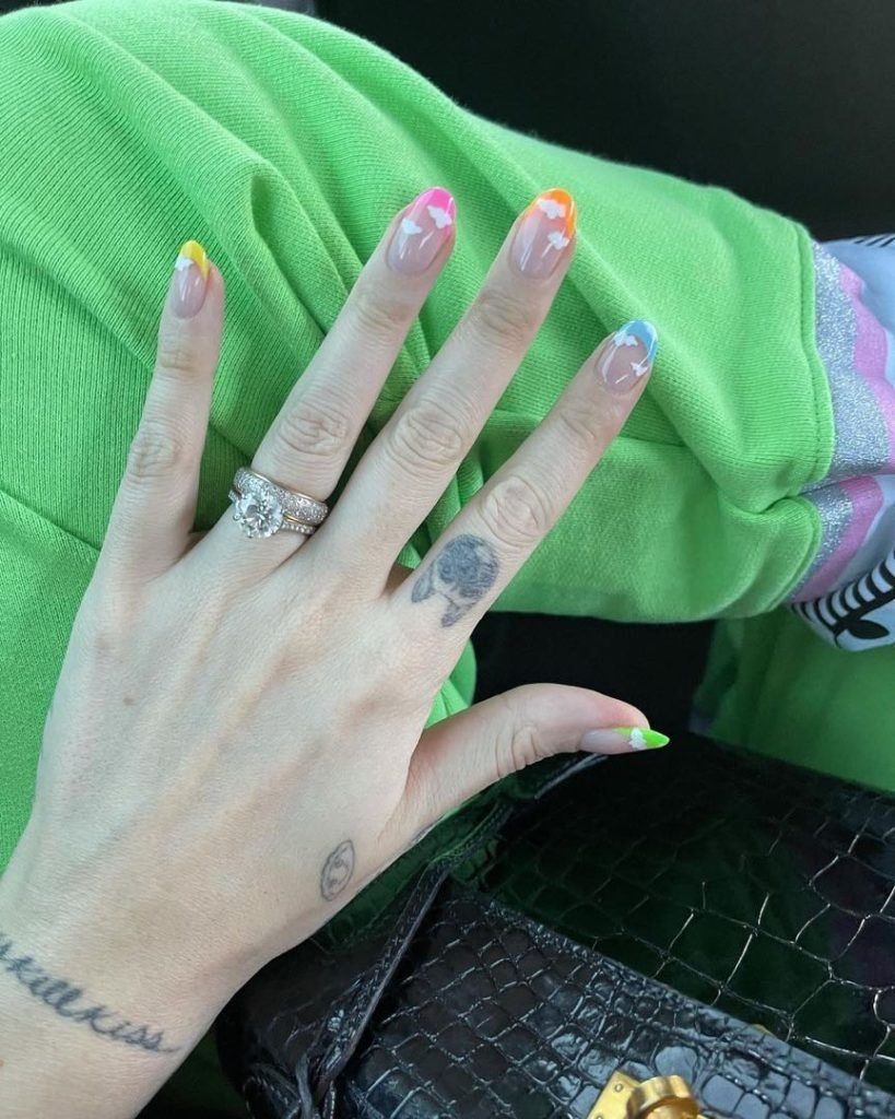 - Pintá las uñas a tu elección o elegí un estampado. En el caso de Kylie, se decantó por una mano de un color y la otra mano, de un color distinto.