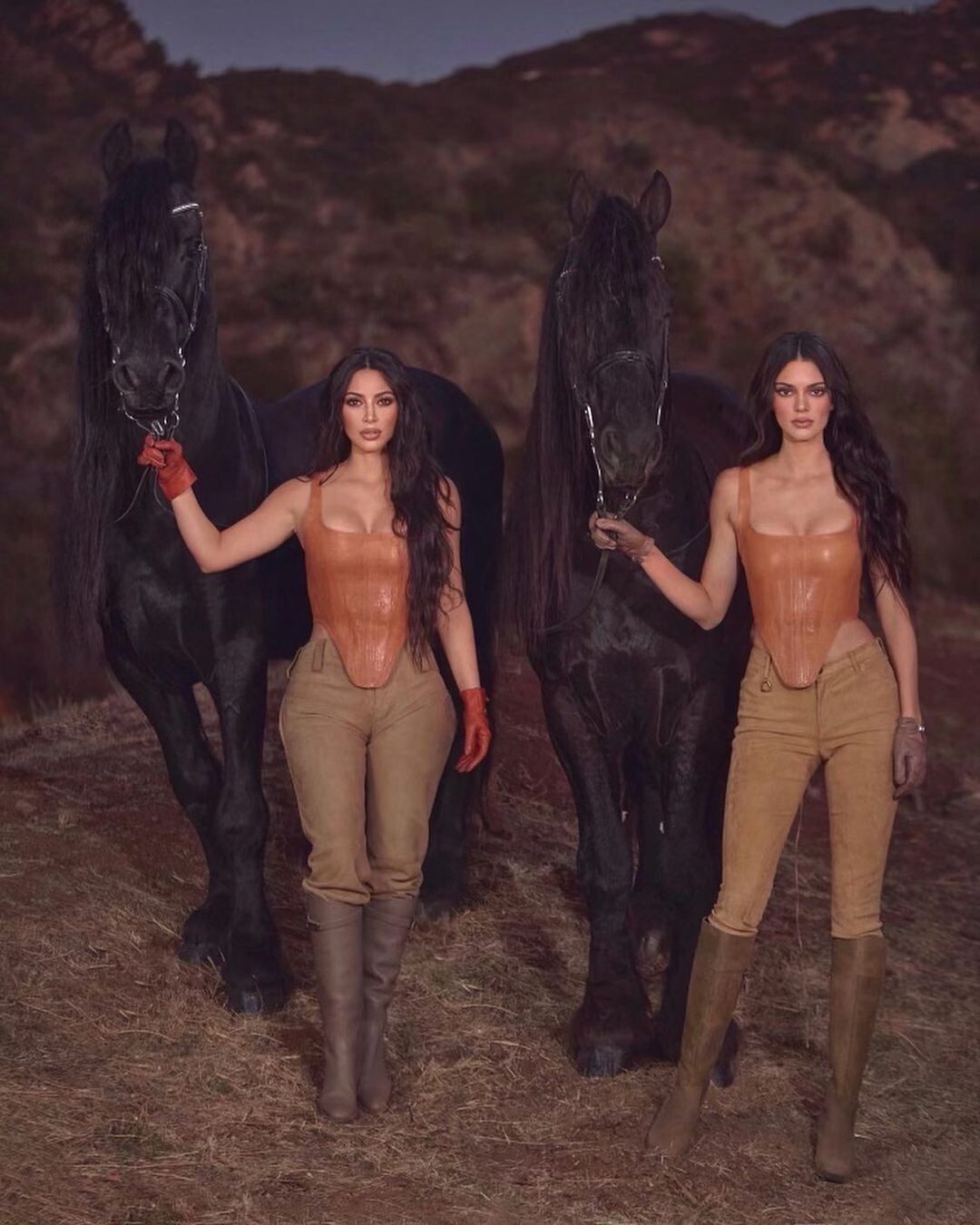 Las dos hermanas posaron muy sexies con pantalones de montar, botas de caña alta y un corsé de cuero, todo en la gama de los marrones.