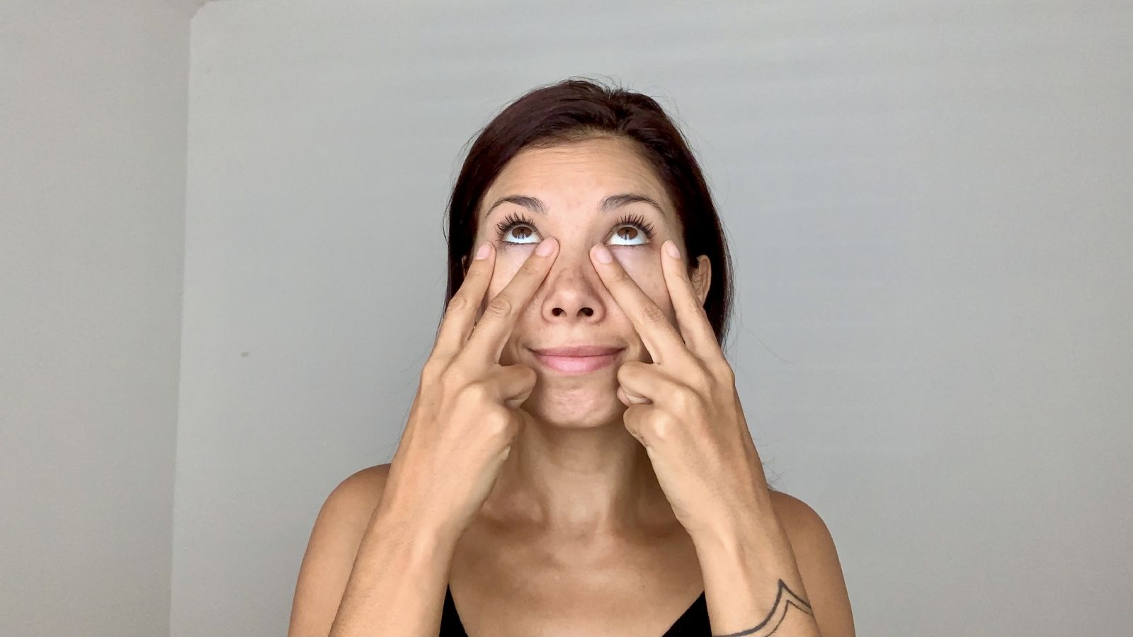 Deberás realizar este ejercicio en ambos ojos simultáneamente. Presiona muy ligeramente los dedos hacia abajo y mira hacia arriba. ¡El truco aquí es que ¡no puedes arrugar la frente!