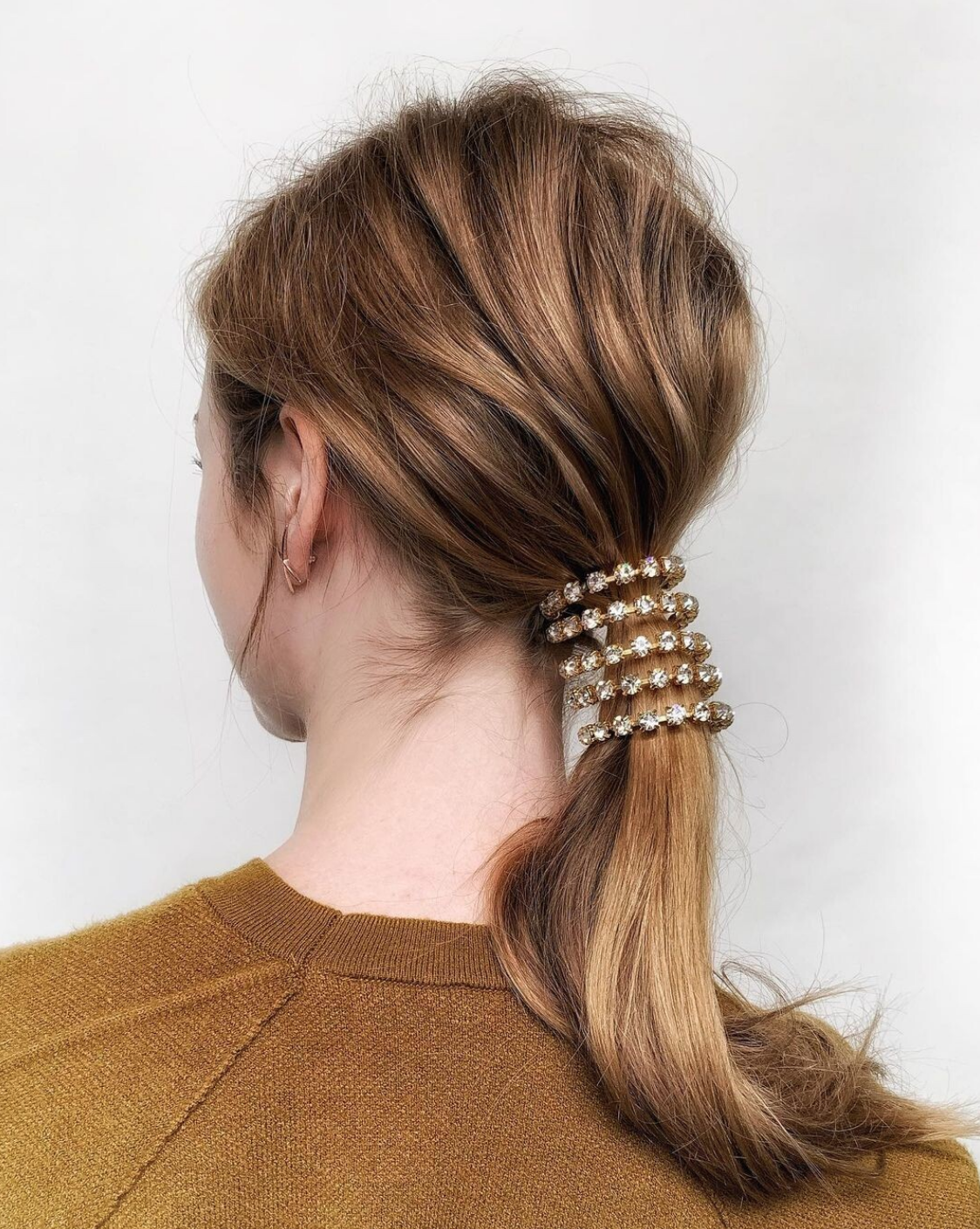 Luego, sujeta el pelo en una cola baja, las más elegantes, y suma un accesorio con piedras de fantasía o lazos de satén ¡Super fácil!
