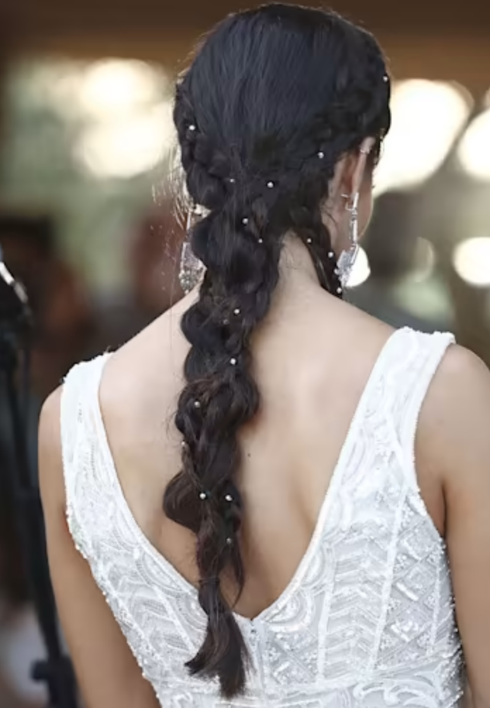 Además, sumó un adorno de pequeñas perlitas y la trenza principal venía de otras dos trenzas superiores que formaban una corona desde la frente hacia abajo para unirse con la trenza principal. ¡Una propuesta tan original como femenina y estilosa!