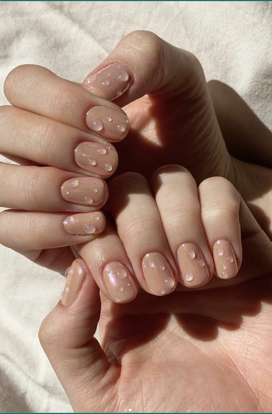 Como mejor queda la manicura con efecto mojado o bubble es sobre una base de esmalte neutra o nude que recubra la uña. El brillo estará dado por las gotas, pero hay quienes prefieren trabajar sobre tonos dorado sutil u otros colores metalizados.