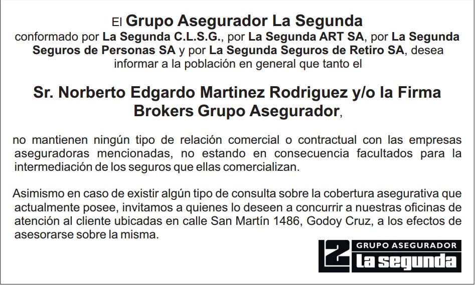 MDZ Lab Solicitada del grupo asegurador La Segunda El grupo asegurador La Segunda emitió una solicitada dirigida a la población en general. El grupo asegurador La Segunda emitió una solicitada dirigida a la población en general. MDZ Sociedad 4 de septiembre de 2015 · 13:32 hs + Seguir en
