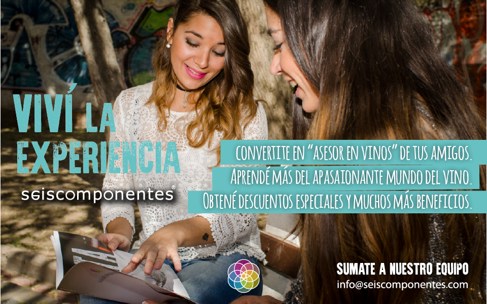 Seiscomponentes es una empresa mendocina que se centra en buscar, seleccionar y ofrecer los mejores vinos del mercado manteniendo los precios sugeridos de las bodegas. Esta empresa de servicios, conformada por un grupo de jóvenes profesionales conocedores y gustosos del vino, es pionera en la venta DIRECTA de vinos y afines por catálogo. Ofrece la posibilidad de comprar productos cuidadosamente preseleccionados, contando con un asesoramiento personalizado y la comodidad de recibirlos donde el consumidor lo desee. A sus ASESORES EN VINOS les brinda la versatilidad del sistema y la posibilidad de comprar con importantes descuentos, pudiendo lograr un desarrollo sin límites.