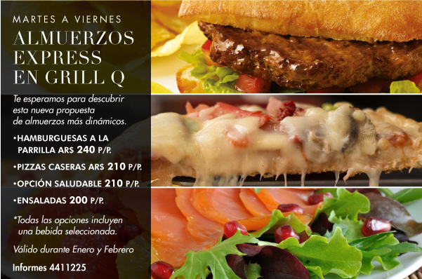 De martes a viernes durante los meses de enero y febrero, los Chefs de Grill Q, te sorprenderán con su nuevo menú de medio día, platos rápidos para que aproveches tu hora de almuerzo.