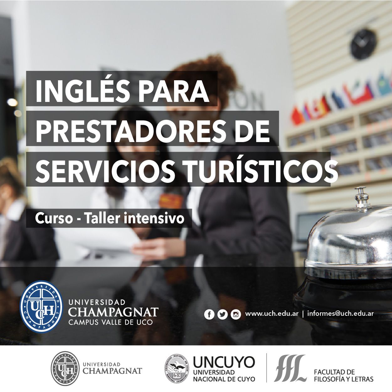 El mismo tiene como principal objetivo, aumentar la competitividad turística y mejorar la prestación del servicio a extranjeros en el Valle de Uco. La Universidad Champagnat, en alianza con la Universidad Nacional de Cuyo, convocan a todos los prestadores de servicios turísticos e interesados a inscribirse en el curso intensivo orientado, con prácticas, en restaurantes y bodegas de la zona "Inglés para Prestadores Turísticos".