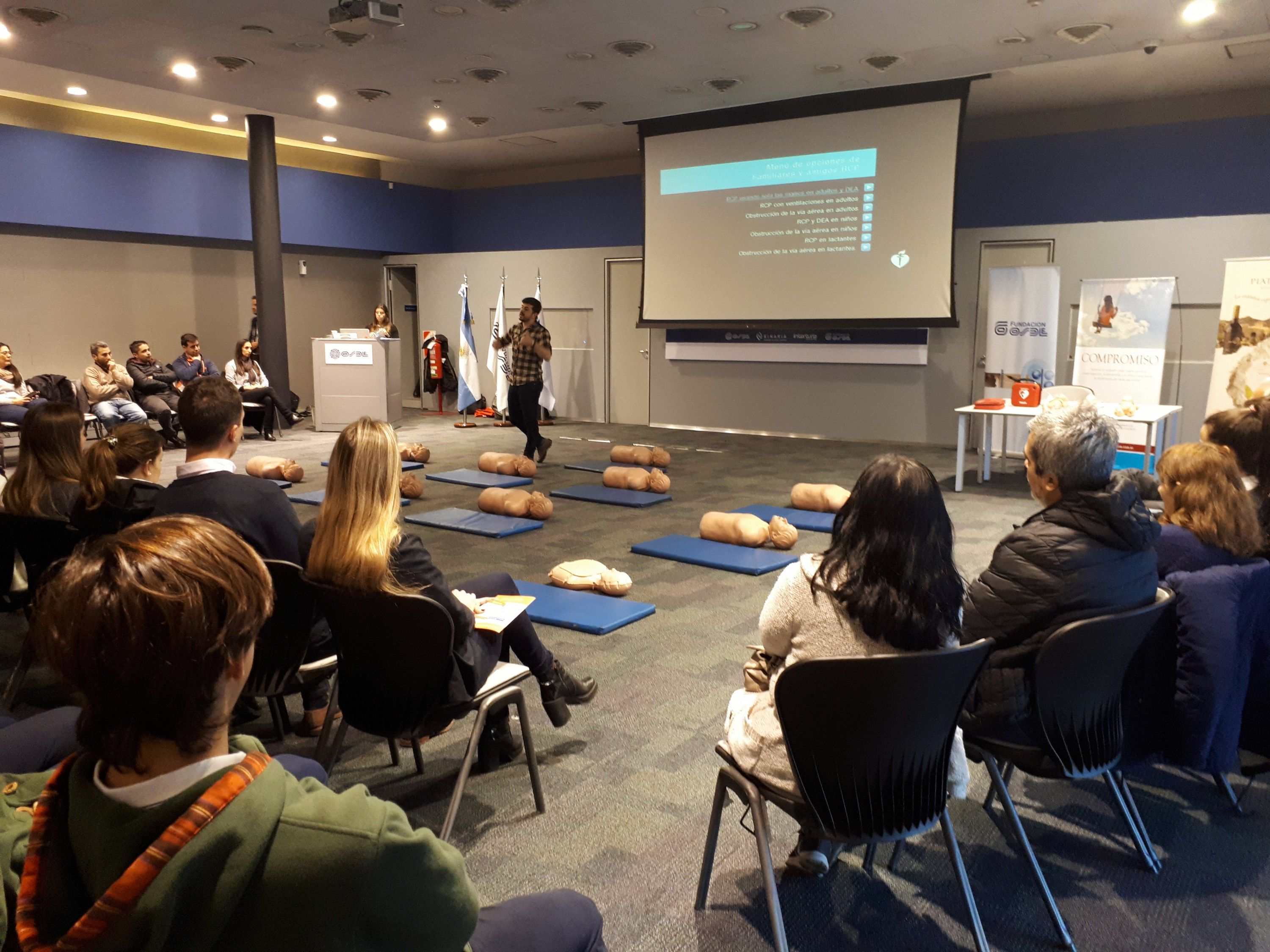 Los instructores informaron y enseñaron sobre reanimación cardiopulmonar y maniobras de desobstrucción de la vía aérea (asfixia) en adultos, niños y lactantes; e introducción al manejo del DEA (desfibrilador externo automático).