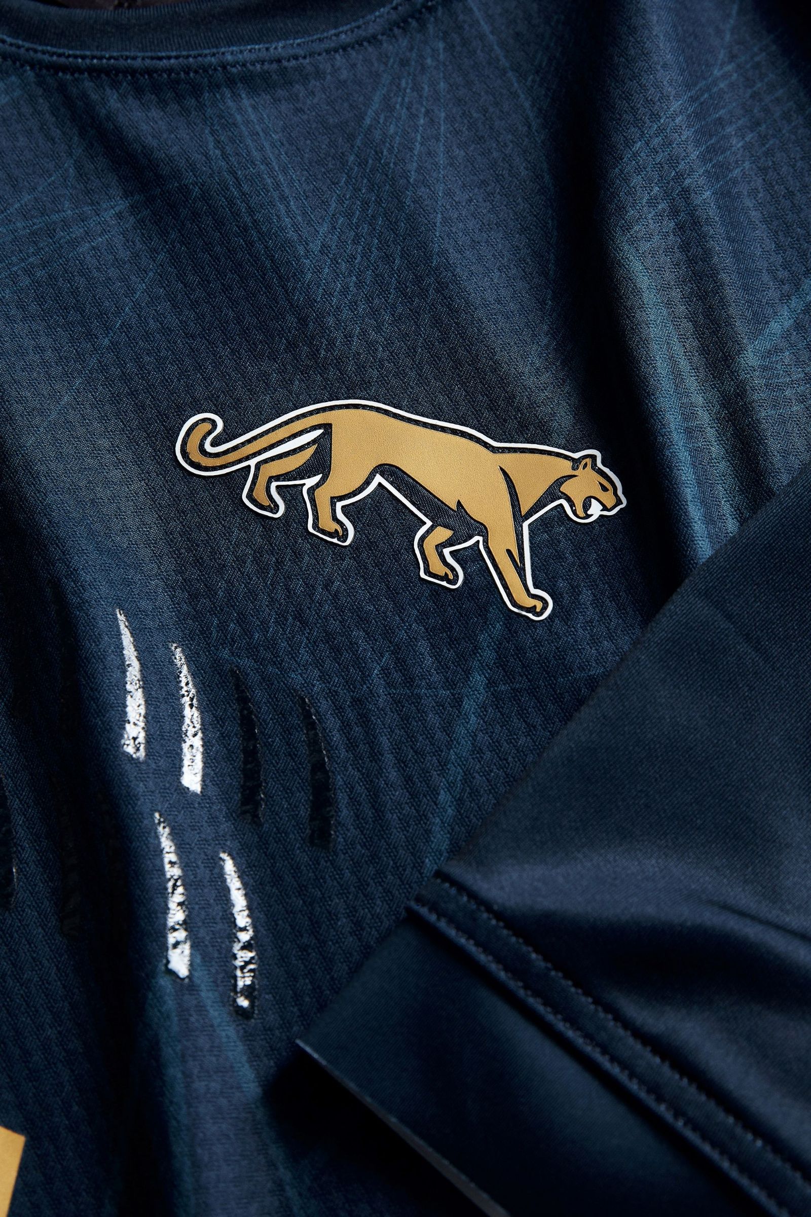 La camiseta alternativa de los Pumas también se presenta en su versión Fan, tanto para adultos como para niños; confeccionada en microfibra 100% poliéster, un tejido suave con tecnología de absorción. Los motivos de laureles están sublimados en la