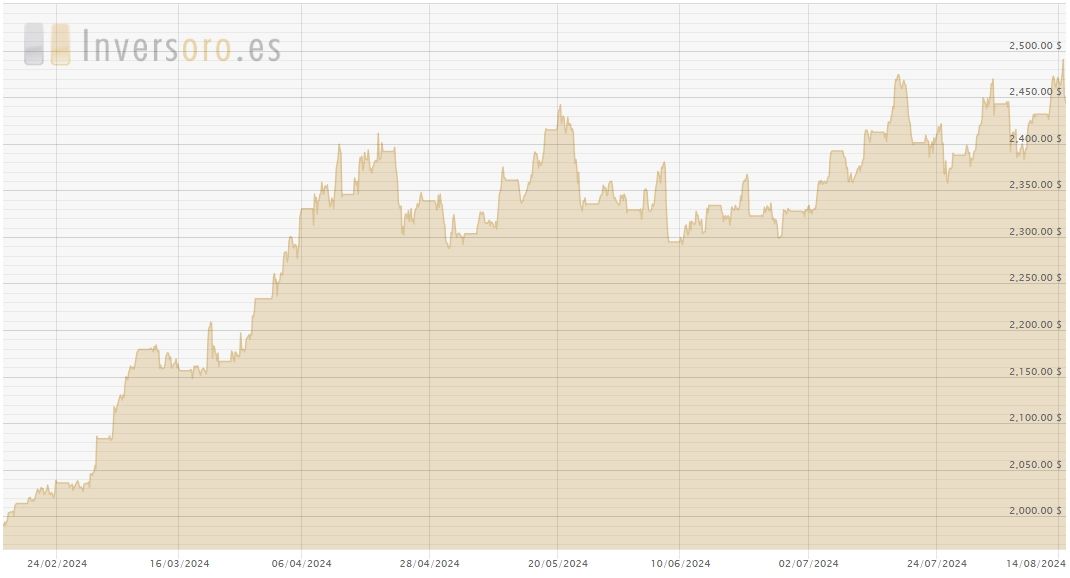 En tan solo seis meses el oro se vio beneficiado en un 24%, donde su valor fue creciendo mes a mes. En enero el metal precioso se comerciaba a $1.984 dólares por onza y, en la actualidad, su cotización oscila entre los $2.440 y los $2.470 dólares.
