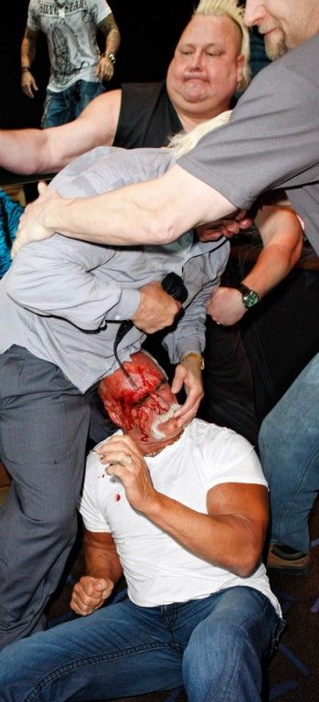 La sangre le corría por el rostro de Hulk Hogan. ¿Cómo ocurrió todo?, resulta que se vio involucrado en una salvaje pelea con Ric Flair, en una conferencia de prensa para promover su lucha en el cuadrilátero en Australia.