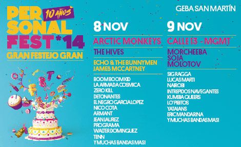 El Personal Fest anunció cuáles serán las bandas que tocarán durante las dos jornadas de su edición 2014, que se llevará a cabo los días 8 y 9 de noviembre en GEBA. Los Arctic Monkeys liderarán el line-up de la noche inicial junto a los Hives, Echo & The Bunnymen y James McCartney. Mientras que Calle 13, MGMT, Soja, Morcheeba y Molotov serán encargados del cierre.