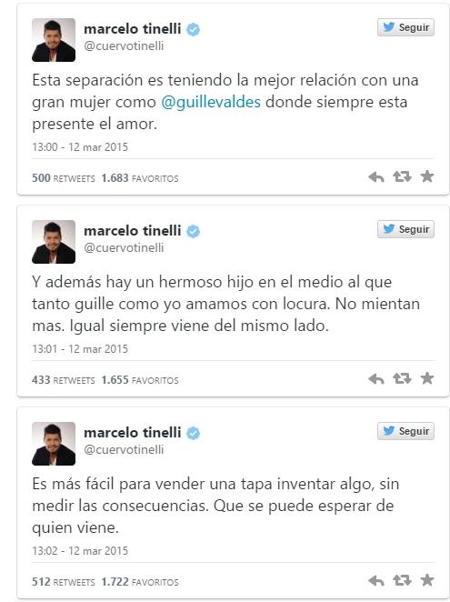 "Con Marcelo no hay término medio, tómame o déjame. Él se impone llevar adelante determinado proyecto y lo ubica como prioridad absoluta. Todo lo demás, se convierte en secundario. Inevitablemente, la relación con Guillermina Valdés llegó a su punto de crisis terminal (sociedad que se disolvió en muy buenos términos) porque la pareja, en todo su universo no contaba con los mínimos espacios de saludable y necesaria convivencia",completó.