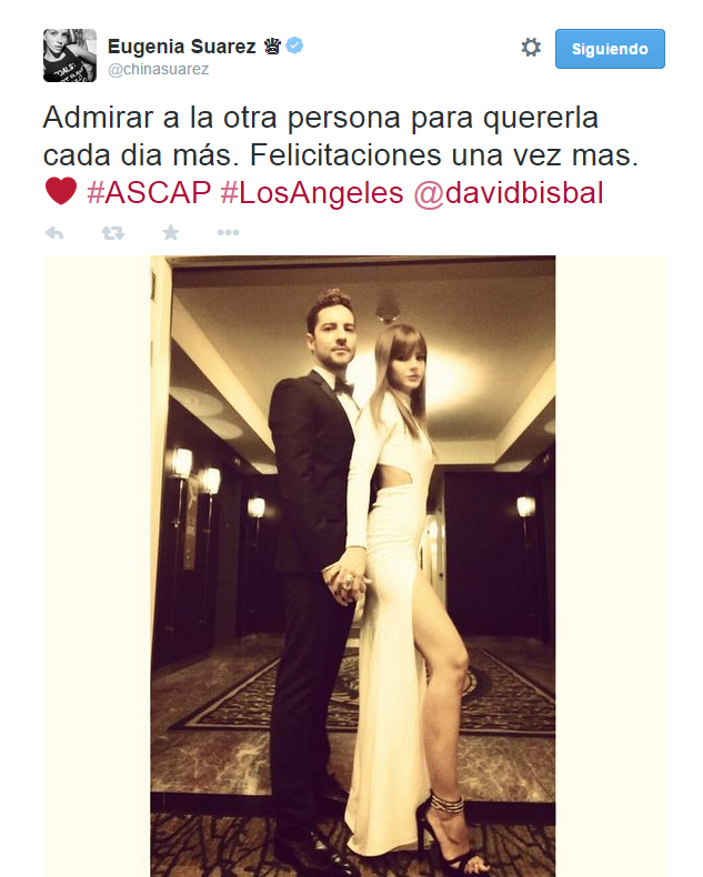 A días de celebrar su cumpleaños 23 alejada de su pareja, Eugenia "China" Suárez pudo reencontrarse con el español David Bisbal. La actriz argentina estuvo a su lado en una entrega de premios en Los Ángeles en la que el cantante recibió una distinción.
