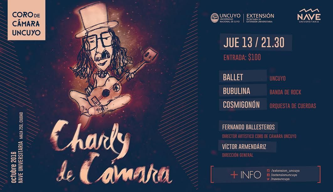 El jueves 13 de octubre, a las 21:30 en la Sala Roja de la Nave Universitaria (Maza 250), el Coro de Cámara de la UNCUYO interpretará Charly de Cámara, un concierto en homenaje a Charly García, donde recorrerán toda la carrera del astro del rock con canciones de todas las épocas: Sui Generis, Serú Girán y su frondosa etapa solista.
