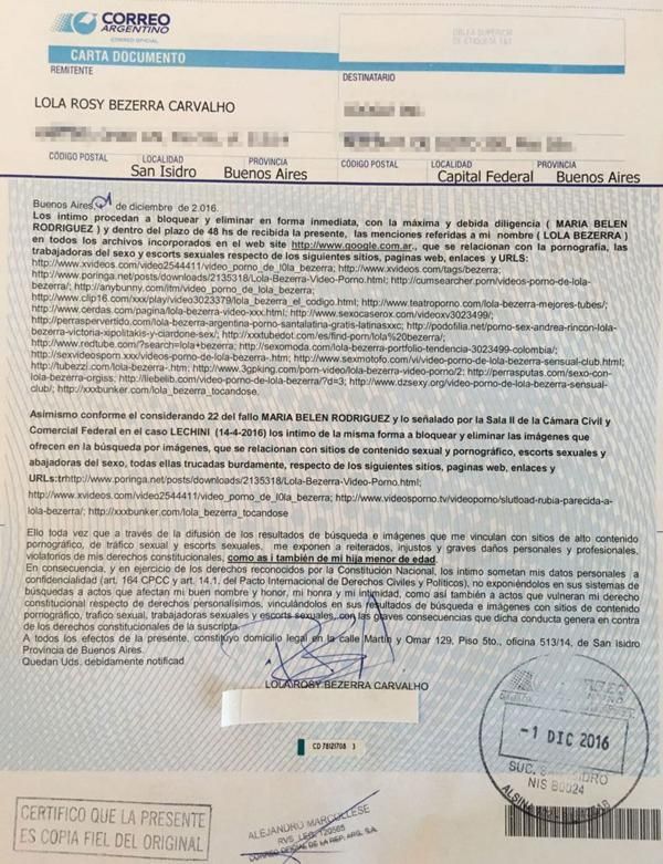 "Los íntimo (a que) procedan a bloquear y eliminar de forma inmediata, y dentro del plazo de 48 horas, las menciones referidas a mi nombre en todos los archivos incorporados en el web site (correspondiente), que se relacionan con la pornografía, las trabajadoras del sexo y escorts sexuales", advierte Bezerra. Y a continuación, acerca un listado de las páginas que usan fotos suyas, sin su consentimiento. Además, existiría un video explícito de una mujer que identifican como ella, aunque no lo sea, claro.