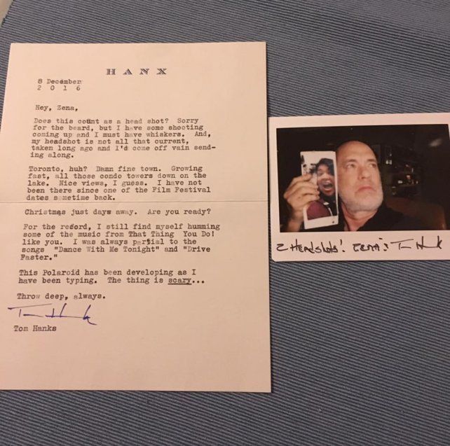 "Hey, Zena. ¿Cuenta esto como una foto de mi cara? Lo siento por la barba, pero dentro de poco tengo una sesión de fotos y debo dejarme bigote", escribe Hanks. En la misiva, el estadounidense reflexiona sobre el mercado inmobiliario de Toronto, las vacaciones navideñas y su pasión, también, por Eso que tu haces!: "Para que conste, todavía canturreo las canciones de The Wonders. Siempre he sido muy partidario de los temas Dance With Me Tonight y Drive Faster".