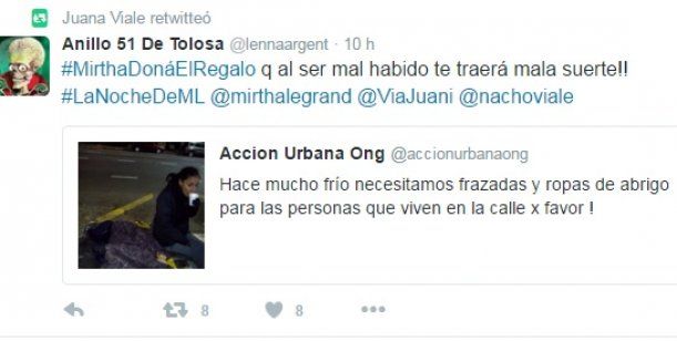 En este marco, durante la noche, en las redes sociales los usuarios hicieron una campaña con el hashtag #MirthaDonáElRegalo y, entre los adheridos a la causa, se sumó nada más ni nada menos que su nieta Juana Viale. "Que Mirtha done el regalo que al ser mal habido te traerá mala suerte!!", retuiteó la actriz.