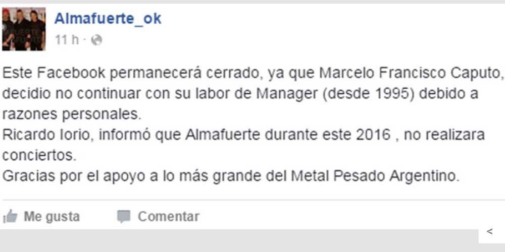 Por un lado, publicó un video su el nuevo Facebook y Twitter del grupo en el que confirma la noticia: "Confirmo que en el transcurso de este año Almafuerte no se va presentar. Vamos a tratar de hacer algunas cosas que teníamos colgados tanto yo, como el Tano (Marciello, guitarrita), Bin (Valencia, baterista) y Beto (Ceriotti, bajista)", explica Iorio con música de la banda de fondo. Y cierra con un elocuente "¡Aguantensé!".