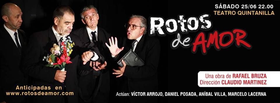 El genial elenco que forman Marcelo Lacerna, Víctor Arrojo, Daniel Posada y Aníbal Villa, bajo la dirección de Claudio Martínez, dará vida a la pieza de Rafael Bruzza Rotos de amor, que reúne una serie de cuadros cómicos, a través de cuatro personajes, todos ellos visitadores médicos, pero “perdedores sin remedio”.