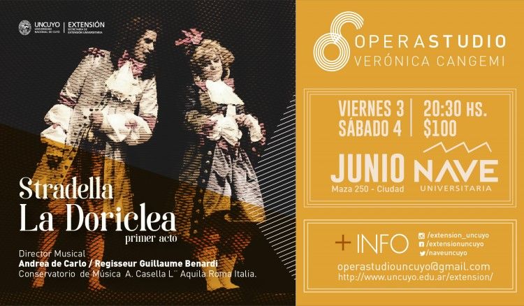5 - "La Doriclea". Música. Opera Studio de la UNCuyo estrena la primera obra lírica que monta el organismo artístico que dirige Verónica Cangemi. A las 20.30 en la Nave Universitaria, Parque Central. Entradas a la venta en la boletería de la sala.
