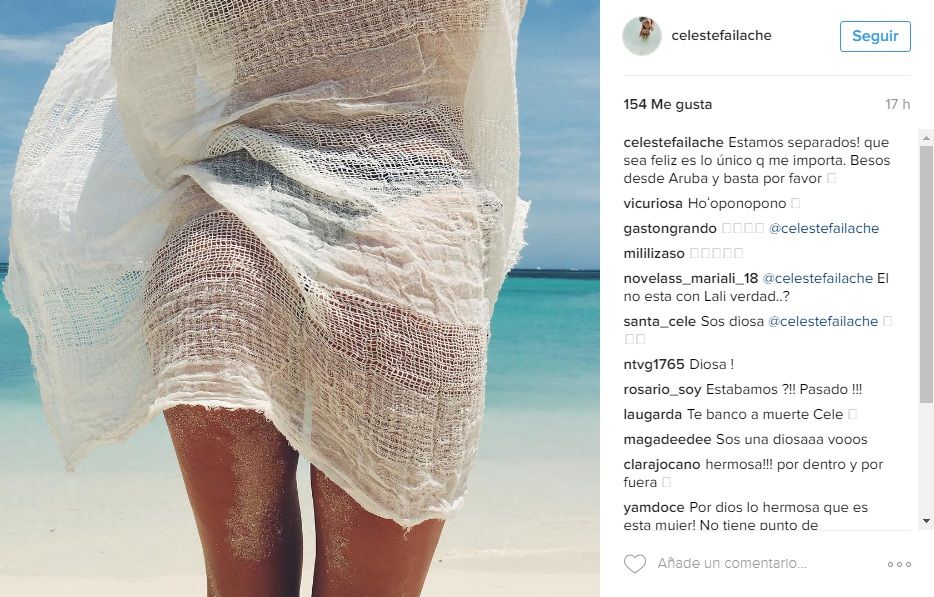 Lo cierto es que Failache se volcó a las redes sociales para aclarar que está separada de Nazareno. "Estamos separados! Que sea feliz es lo único q me importa. Besos desde Aruba y basta por favor", expresó la fotógrafa y ex del actor con una imagen de su cola, que horas después borró.