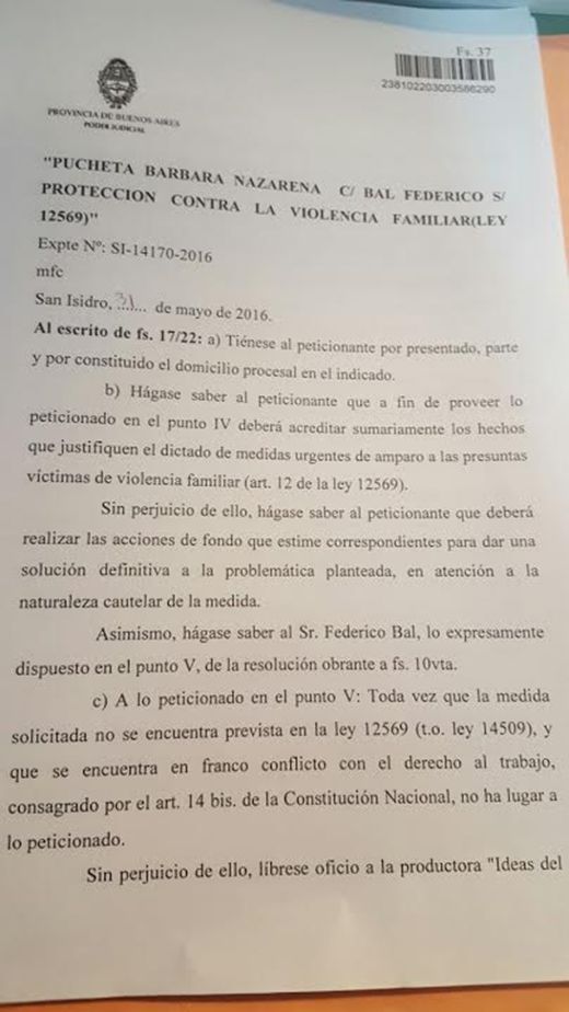 Según mostró José María Listorti, el pedido fue realizado antes del 31-5 pasado, fecha en que el juez lo rechazó -dicho documento lo mostró en cámara-. "Fede, a través de su abogado, le dijo al juez que como había una medida perimetral, él ya tenía arreglado estar en el Bailando y Barbie estaría rompiendo lo que firmó", explicó el abogado Mauricio D'Alessandro.