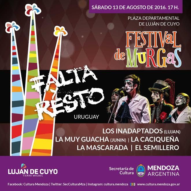 3- Festival de Murgas. Música / Murga. Desde las 17 en la plaza departamental General San Martín (Luján de Cuyo). Entrada gratuita. Ver nota haciendo clic aquí.