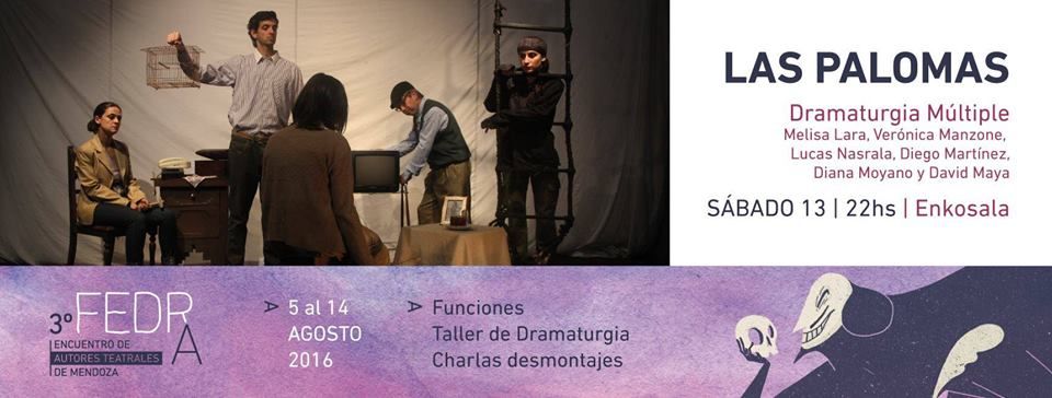 Las palomas cuenta la historia de Jorge un hombre que luego de que su madre muere decide abrir su casa a 4 inquilinos. En esta nueva convivencia los personajes empiezan a develar sus miserias, sus miedos y frustraciones. La obra se presenta en el contexto del tercer encuentro de autores teatrales de Mendoza FEDRA.