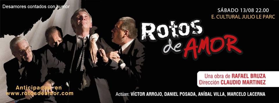 Rotos de Amor es una comedia que de manera tierna y humana habla del Amor con mayúscula. El humor surge en los instantes más sombríos de las historias de cada uno de los personajes y de su dificultad para rearmar sus vidas a partir del vacío de sus quiebres amorosos. Bajo el título Rotos de Amor el autor argentino Rafael Bruza reúne una serie de cuadros cómicos a cargo de cuatro personajes, todos ellos visitadores médicos, pero "perdedores sin remedio". Es una manera diferente de hacer comedia. De forma divertida y cercana, se reivindica la fe en el Amor con todas sus consecuencias. Con Víctor Arrojo, Daniel Posada, Aníbal Villa y Marcelo Lacerna.
