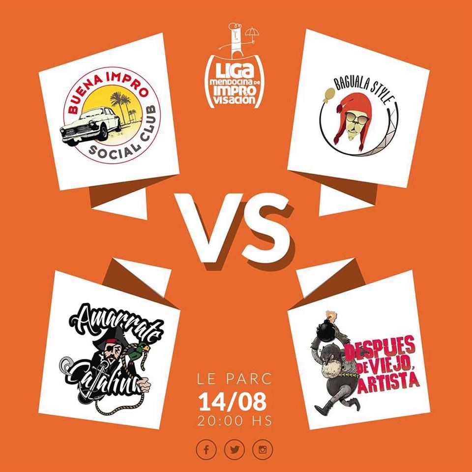Vuelve la Liga Mendocina de Improvisación con un nuevo espectáculo al Espacio Le Parc. Este año 11 equipos se enfrentarán a lo largo del torneo para llegar a la gran final, que se realizará en el mes de octubre. El show, completamente renovado, contará con nuevas escenas, invitados especiales y un jurado de profesionales de la improvisación. En esta fecha se medirán los grupos Buena Impro Social Club, Baguala Style, Amarrate Catalina y Después de viejo, artista.