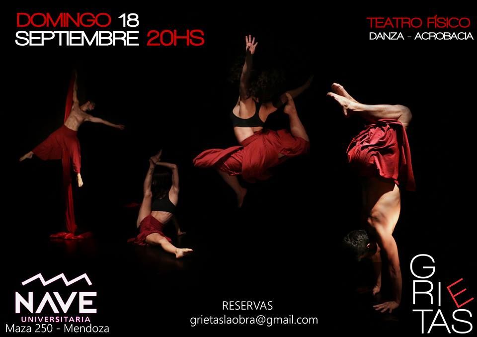 Grietas es el primer espectáculo de la Compañía Inspira Teatro Circo (Buenos Aires) y regresa a Mendoza este fin de semana. Esta noche sube a escena, a las 21.30, en El Galpón Cultural (en el marco del Festival de Danza de Nuevas Tendencias); y mañana, a las 20, en la Nave Universitaria.