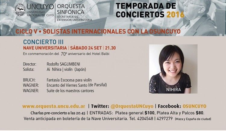 Bajo la batuta de Rodolfo Saglimbeni, la OSUNCuyo presentará esta noche el tercer programa del ciclo Solistas Internacionales con la actuación de la japonesa Ai Nihira.