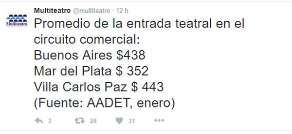 La empresa Multiteatro, que dispone de siete edificios en Mar del Plata y Capital cuya exclusiva actividad es la exhibición teatral, dio a conocer estos datos a través de su cuenta de Twitter.