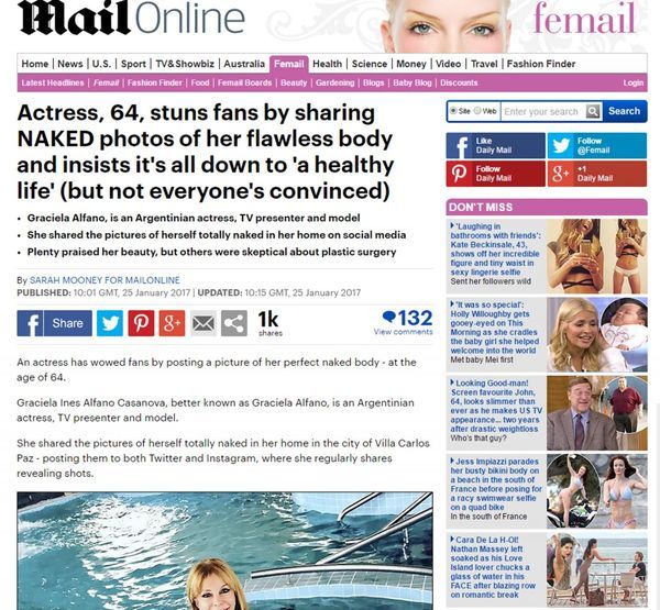 "No lo puedo creer. Me pareció fantástico pasar la frontera y que se tome en cuenta el fenómeno que de alguna manera soy". Esas fueron las primeras palabras de Graciela Alfano cuando se enteró, a partir de Teleshow, de que estaba en los portales extranjeros. Claro, el reconocido sitio inglés Daily Mail, al ver la figura de nuestra diosa nacional, tampoco lo pudo creer. Entonces escribió: "La actriz, de 64 años, aturde a los fans compartiendo fotos desnudas de su impecable cuerpo e insiste en que todo se reduce a 'una vida sana' (pero no todo el mundo está convencido)".