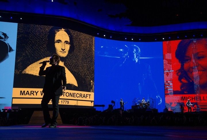 5. TODO SHOW (DE U2) ES POLÍTICO. Ningún show de la banda liderada por Bono estaría completo sin una proclama. Y The Joshua Tree Tour no es la excepción. Esta vez, son las mujeres las que están en el centro de la escena, a la altura de Ultra violet (Light my way), una canción de Achtung Baby que dice "oh, nena, secate las lágrimas de los ojos / sabés que necesito que seas fuerte". Mientras suena, por la pantalla van y vienen imágenes de Patti Smith, de Malala, de Michelle Obama, de Madonna, de Lena Dunham, de las Pussy Riot, de Ellen DeGeneres, de Oprah, de Aretha Franklin. Y un neologismo que intenta torcer el camino frecuente de los hechos: Herstory, una fusión entre el pronombre femenino y la historia. "Dedicada a todas las mujeres de nuestras vidas", casi susurró Bono en Detroit antes de que la pantalla dijese "Mujeres del mundo, únanse". La consigna desembarca en un país donde se comete un femicidio cada 30 horas. Y probablemente no será el único momento político del show en Argentina: la última canción de The Joshua Tree es Mothers of the Disappeared, que alguna vez tuvo a las Madres de Plaza de Mayo sobre el escenario de los irlandeses. Tres elementos. La pantalla más grande que jamás se haya usado, uno de los cuartetos más importantes de la historia del rock y canciones imbatibles.