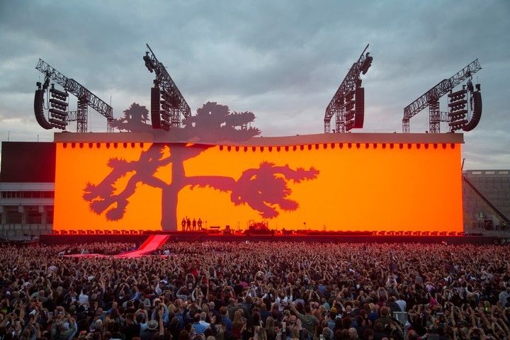 2. OJOS QUE VEN, CORAZÓN QUE SIENTE. No es nuevo el vínculo entre los shows de U2 y el despliegue tecnológico. Esta vez, esa apuesta es al mismo tiempo minimalista y ambiciosa. Sobre el escenario no hay más que una pantalla. Pero ocurre que la pantalla es enorme: su largo es equivalente al de ocho arcos de fútbol uno al lado del otro, y de alto es como apilar cuatro aros de básquet. La resolución con la que transmite -"casi" 8K, dice a Clarín el manager de gira de los irlandeses, y se ensancha cuando asegura que es "la pantalla de alta resolución más grande que se haya usado en un tour"- hace lamentar cualquier mínima miopía o astigmatismo: ojos que no funcionen del todo bien estarán desaprovechando una oportunidad única. Y lo que allí se ve desde que se enciende, cuando U2 empieza a tocar The Joshua Tree, es un recorrido que empieza por una ruta y que se va nutriendo de las imágenes que, en su mayoría, tomó para la gira el fotógrafo y realizador Anton Corbijn, el mismo que retrató a los irlandeses en el desierto de Mojave para la tapa del disco que celebran.
