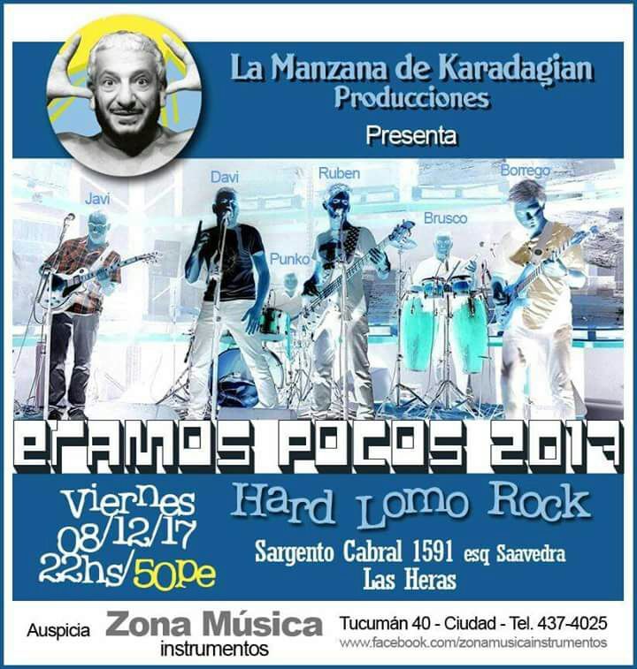 7 - Éramos Pocos vuelve a los escenarios. MÚSICA. La banda mendocina fundada en 1988 vuelve al ruedo luego de un tiempo de descanso. Esta noche se presentará con Julio Murillo (batería y coros), Juan Manuel Valverde (percusión y coros), David Pagés (guitarra), Rubén Riveros (bajo y coros), Javier Pérez Cremaschi (guitarra) y David Sampirisi (voz).