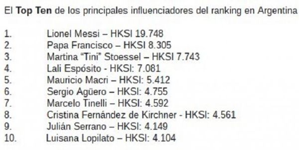 Lionel Messi ocupa el primer puesto, mientras que el Papa Francisco está en segundo lugar. Las cantantes Tini Stoessel y Lali Espósito ocupan el tercer y cuarto puesto.
