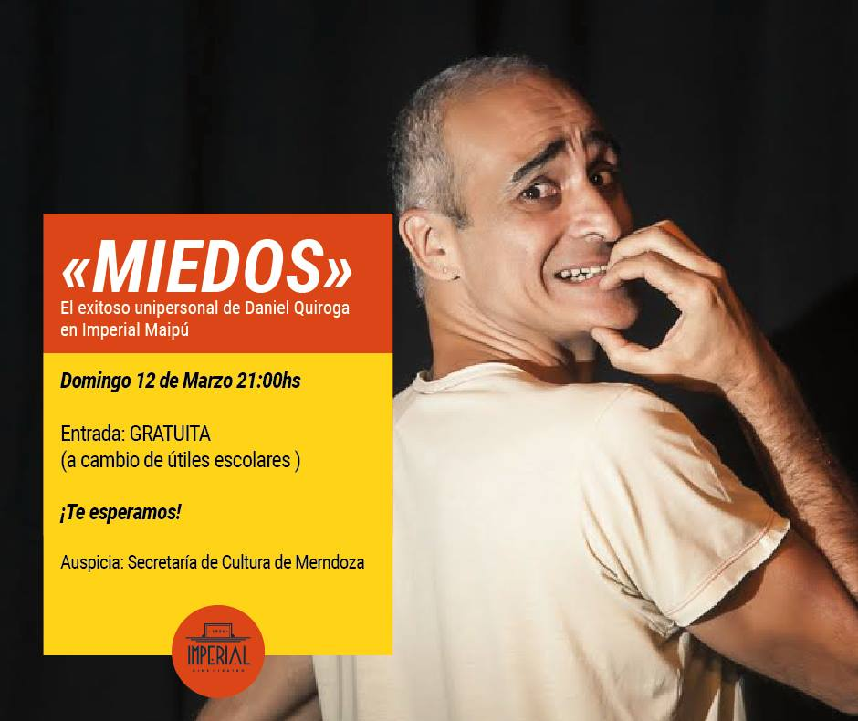 El temor, y varias de las formas que este asume, es el disparador de Miedos, el unipersonal de humor, del reconocido actor mendocino Daniel Quiroga, que se presenta este domingo 12 marzo a las 21, en el Teatro Imperial de Maipú. La función de Miedos, auspiciada por la Secretaría de Cultura de Mendoza, se brindará con entrada gratuita a cambio de útiles escolares, los que serán destinados a escuelas del departamento.