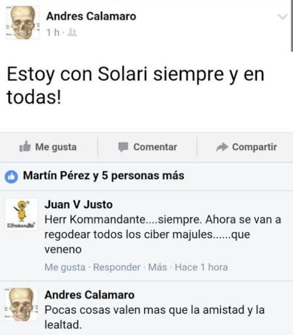 Sin embargo, Andrés Calamaro tomó una postura diferente y salió a defenderlo públicamente. "¡Estoy con Solari siempre y en todas!", escribió el Salmón en su cuenta oficial de Facebook. Al escribir esta declaración, generó un gran revuelo y recibió muchos comentarios.