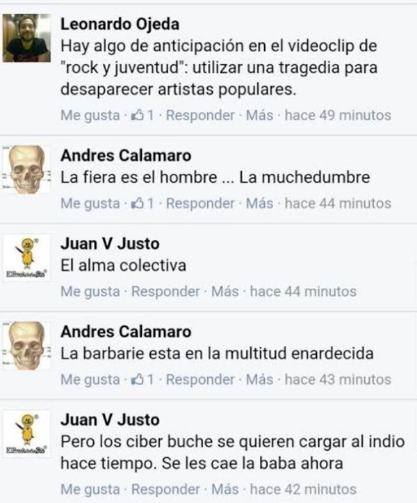 Desde el entorno íntimo del Indio, escribieron un descargo sobre el dramático episodio y criticaron a los medios. "Para las familias que esperan a los suyos: una vez más, de forma irresponsable y mezquina, los medios están vendiendo pescado podrido. Por favor no crean en todo lo que se dice. Esperamos que con el correr de las horas todos vayan llegando a sus hogares", publicaron en la cuenta Virumancia de Facebook.