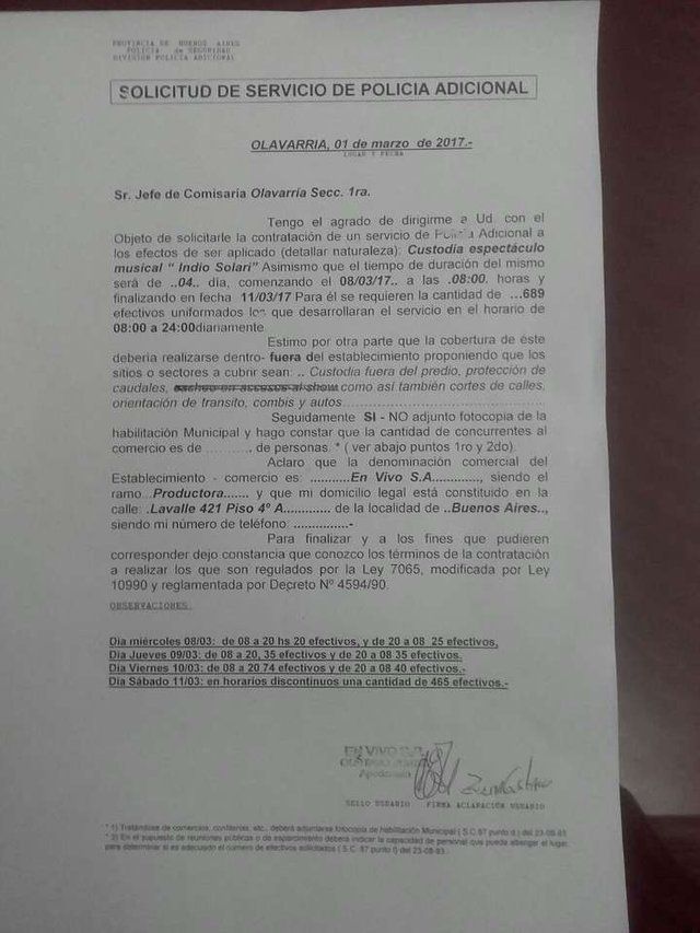 El papel entregado a la comisaría 1º de la ciudad, pedía 689 efectivos de policía adicional para los días 8, 9, 10 y 11 de marzo, para reforzar los 700 uniformados que la provincia de Buenos Aires había enviado a Olavarría para el evento.