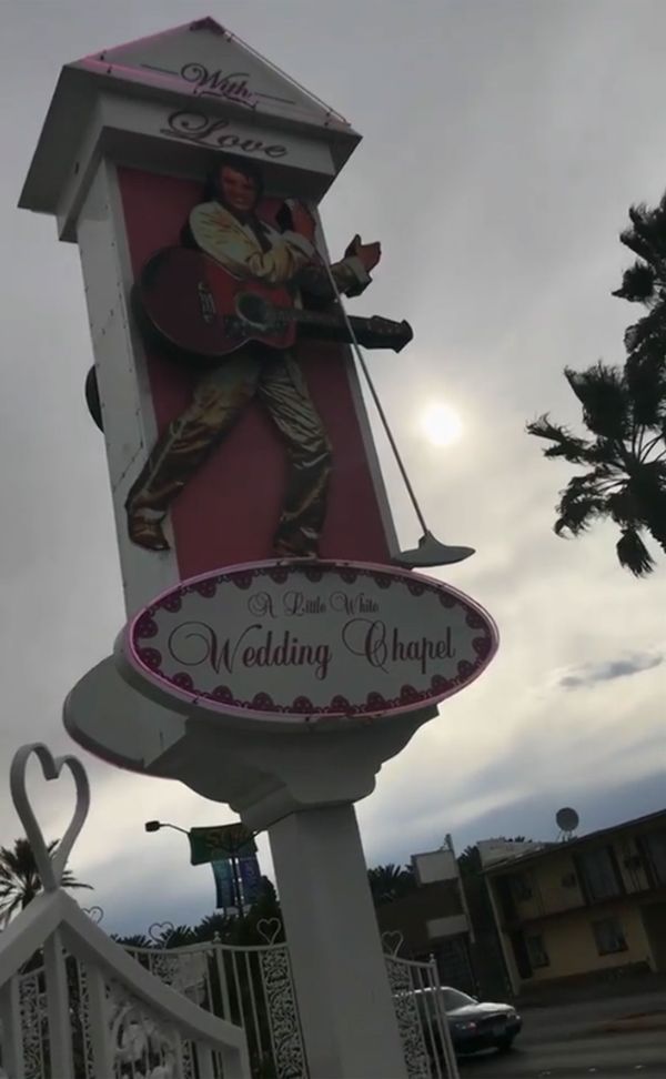 El otro posteo -en Instagram Stories- es igual de sugestivo. Se trata del ingreso a una de las capillas donde es posible cumplir con el rito de casarse en la ciudad del pecado, con un Elvis Presley como padrino: cada año lo hacen ¡120.000! parejas, a cambio de unos 140 dólares, como mínimo.
