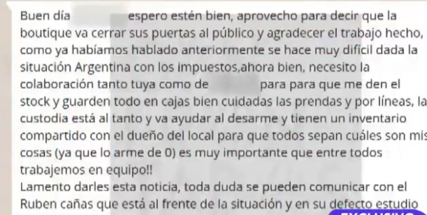 "Aprovecho para decir que la boutique va a cerrar sus puertas al público y agradecer el trabajo hecho. Como ya habíamos hablado anteriormente se hace muy difícil la situación en Argentina con los impuestos", comienza, y luego de la introducción, pide las tareas.