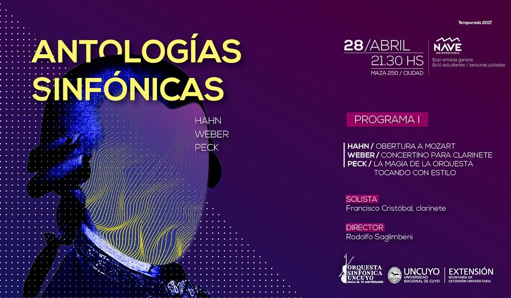 El ciclo Antologías Sinfónicas comenzará con su primer concierto el viernes 28 de abril a las 21:30 en la Nave Universitaria bajo la dirección del maestro Rodolfo Saglimbeni. Contará con la actuación del clarinetista mendocino Francisco Cristóbal interpretando el Concertino de Carl María von Weber. Este joven músico no vidente es alumno de la Facultad de Artes UNCuyo y fue seleccionado en el concurso de alumnos 2016. El programa abrirá con la Obertura Mozart del compositor venezolano-francés Reynaldo Hahn, en tanto que como obra principal se ofrecerá La Magia de la Orquesta y Tocando con Estilo del compositor norteamericano Rusell Peck, con el fin de demostrar los colores orquestales e ilustrar el rol del director.