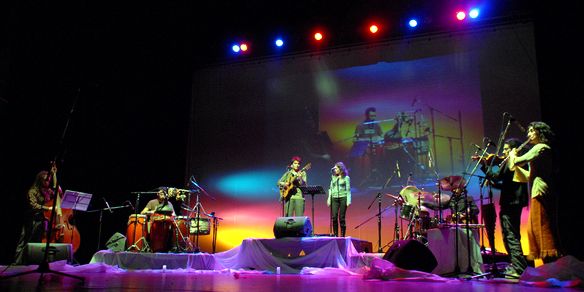 Músicos en escena: Sebastián Alcaraz, María Eugenia Moreno, "Quique" Öesch, Raúl Rivero, Willy Fabre, Leo Martínez y Francisca Figueroa.