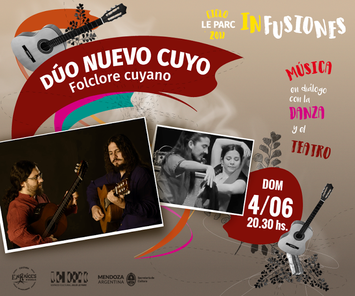 El próximo domingo 4 de junio (20.30hs) comienza el esperado Ciclo INfusiones en el Espacio Cultural Le Parc. Lo hace con la presentación del Dúo Nuevo Cuyo, destacados referentes de la música cuyana en la actualidad, acompañados por Daniela Moreno y Diego Rodríguez, que comparten desde la danza la interpretación de un repertorio de canciones y textos de autor, con adelantos de lo que va a ser su próximo disco.