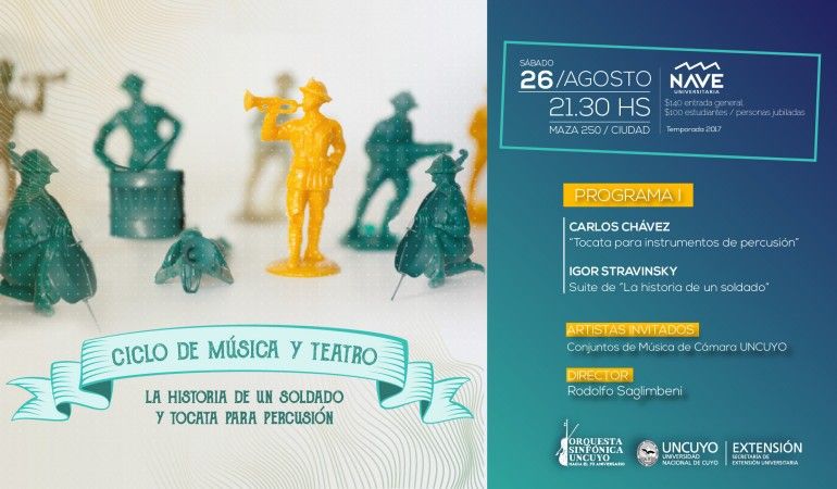 El primer concierto se llevará a cabo el sábado 26 de agosto en la Sala Chalo Tulián de la Nave Universitaria. El mismo presenta una producción semi-escenificada de la obra teatral "La Historia del Soldado" de Igor Stravinski con textos de C. Federico Ramuz.