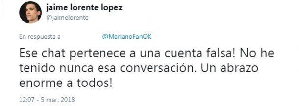 "¡Ese chat pertenece a una cuenta falsa! No he tenido nunca esa conversación. ¡Un abrazo enorme a todos!", escribió Jaime en su cuenta de Twitter.